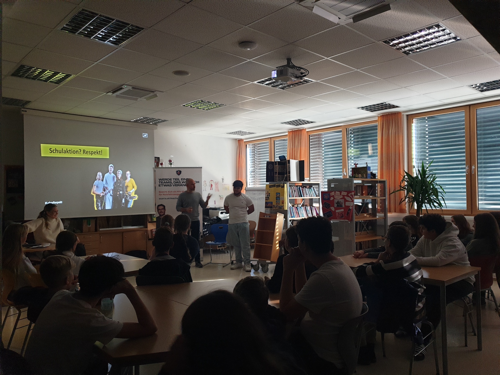 Im Rahmen des Unterrichts Bildungs- und Berufsorientierung waren am 5. November Vertreter der Initiative "Lehre Respekt" und der Fa. Scania für die Schülerinnen und Schüler der 3a und 3c an unserer Schule. Sie vermittelten mit großem Erfolg Informationen rund um das Thema Lehre und beantworteten viele Fragen seitens der Schülerinnen und Schüler. Am 12. November findet derselbe Vortrag auch für die Klassen 3b, 3d und 3e statt, sodass dieses Angebot allen Klassen der 7. Schulstufe zugute kommt.